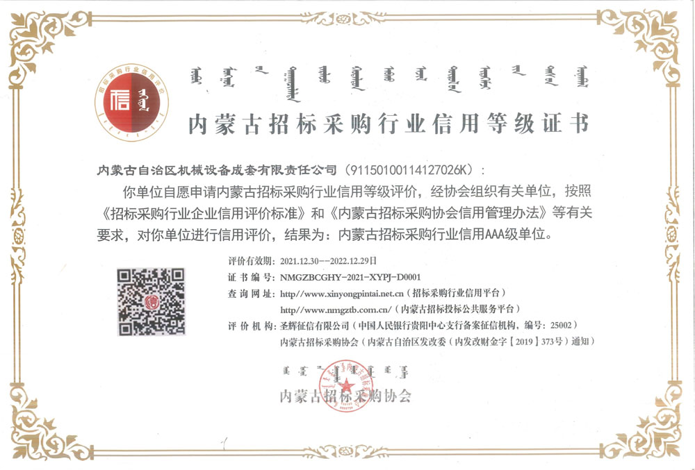 內蒙古招標采購行業信用AAA級單位資格證書